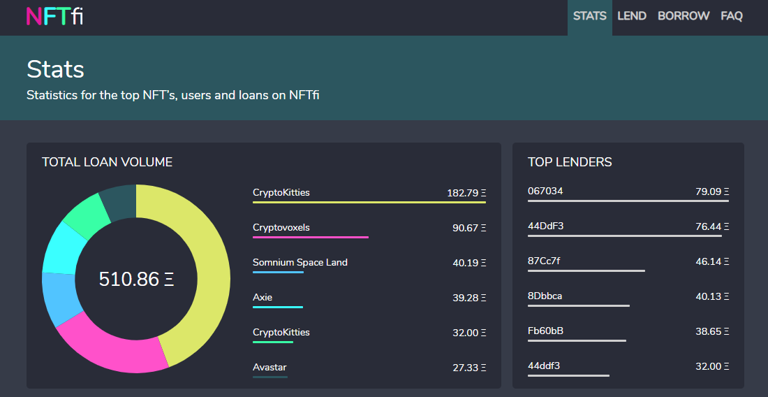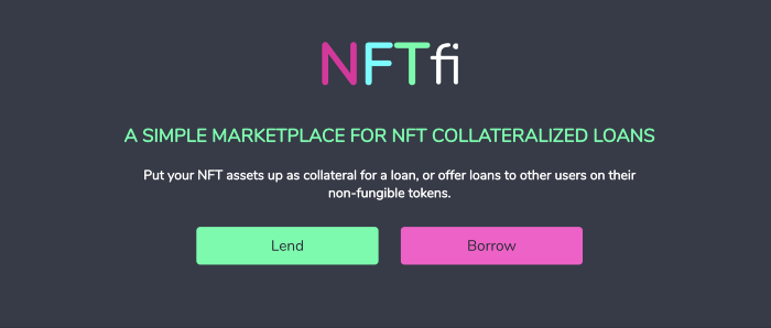 NFTfi는 대체불가토큰(NFT)을 담보로 제공하고 대출을 받을 수 있는 P2P마켓플레이스입니다. 차입자들은 자신이 보유하고 있는 NFT를 담보로 제공하고 코인을 빌릴 수 있고, 대출자들은 코인을 빌려주고 이자를 받을 수 있는 구조입니다.