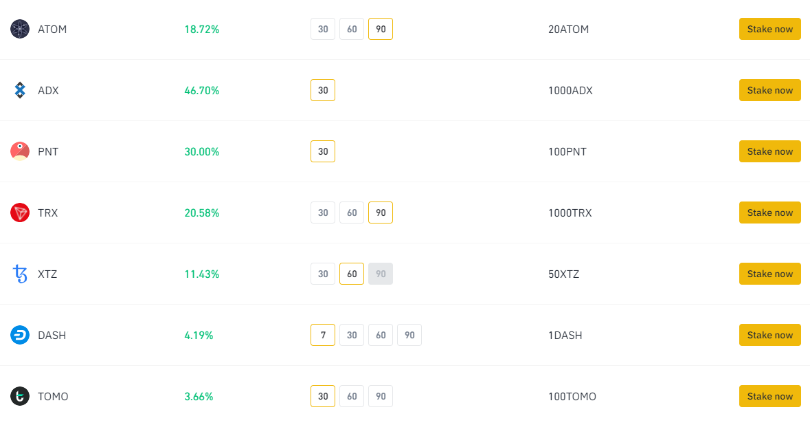 바이낸스에서 공개한 자료에 따르면 만기는 30일/60일/90일까지 총 3가지로 구분되며 트론의 경우 최대 20.58%, 테조스의 경우 최대 16.47%, 코스모스의 경우에는 최대 18.72%의 이자율이 적용됩니다. (여기서의 이자율은 기간환산 이자율이 아닌 연이자율(APY)입니다)