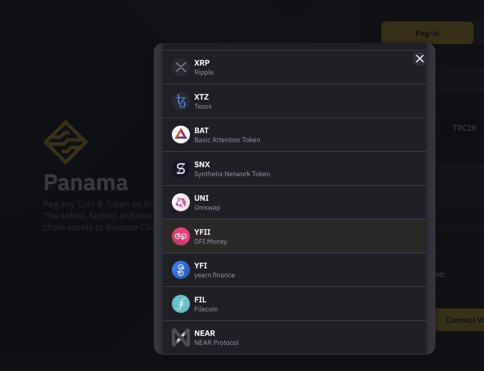 바이낸스 파나마 스왑(Panama Swap)은 바이낸스체인(BEP2)이나 바이낸스 스마트체인(BEP20)에 페깅 토큰을 간편하게 주고 받을 수 있는 인터체인 브릿지 서비스입니다. 바이낸스 익스텐션 월렛만 설치되어 있으면 바이낸스 체인에서 비트코인이나 이더리움, 이오스 등 다른 블록체인의 네이티브 토큰(코인)을 간편하게 주고 받을 수 있습니다.
