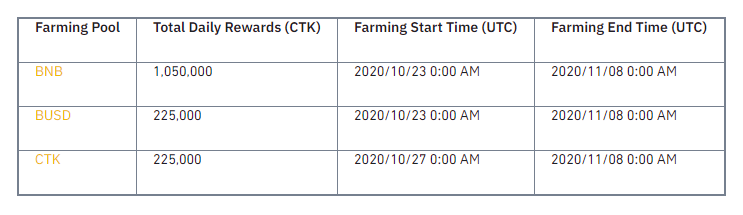 CTK의 파밍은 BNB, BUSD, CTK로 가능한데, BNB와 BUSD의 경우 10월 23일 09시부터 11월 8일 09시까지 16일간 진행되는 반면에, CTK의 경우에는 메인넷 출시 이후인 10월 27일 09시부터 11월 8일 09시까지 12일간 가능합니다.