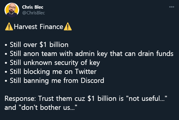 디파이 애널리스트 중 한 명인 Chris Blec이 자신의 트위터를 통해 하베스트 파이낸스의 위험성에 대한 경고를 한 후에 하루만에 이 사단이 일어났는데, 하베스트 파이낸스의 주장처럼 실제로 "플래시 론 공격"인지 아니면 익명의 Harvest Finance팀이 admin key를 사용한 것인지는 아직까지 분명하게 밝혀진 바가 없습니다.