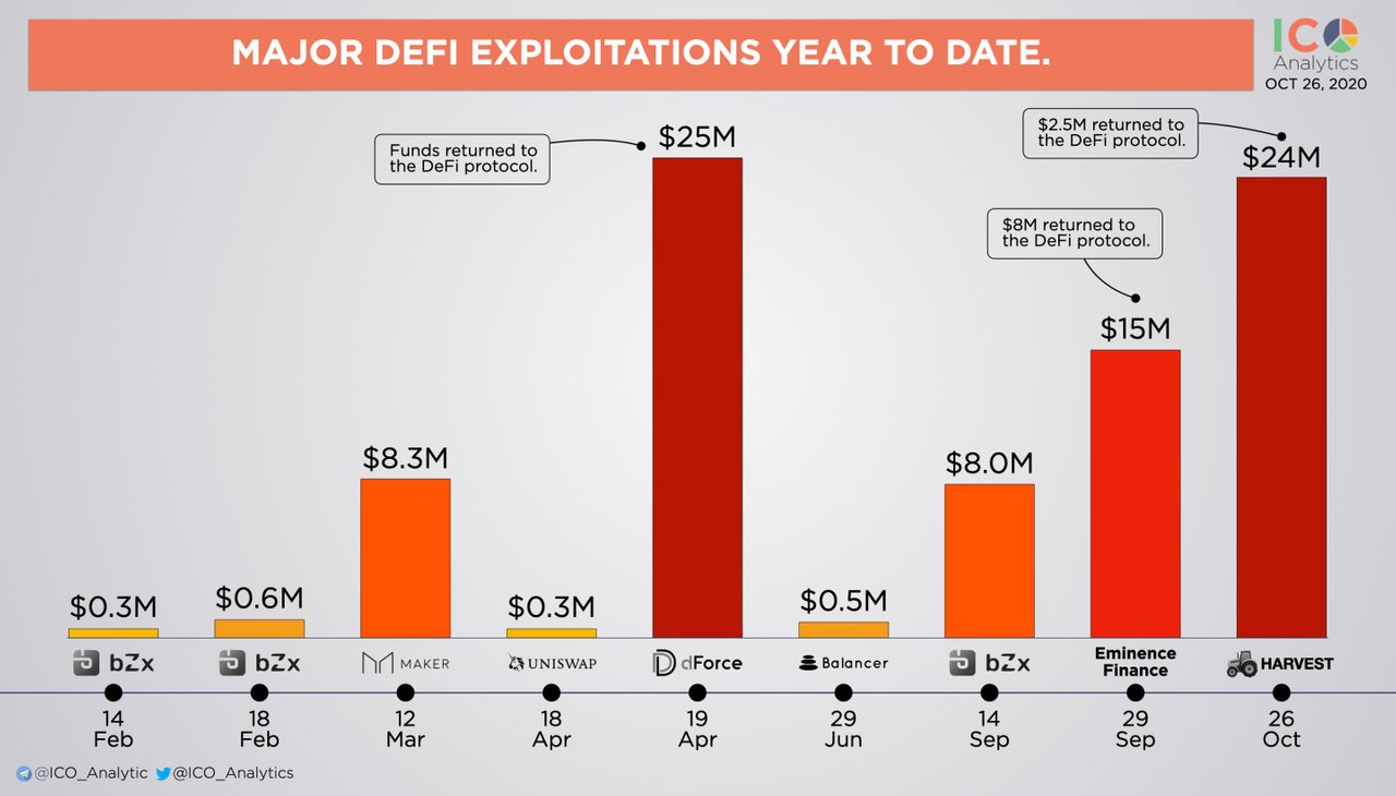 안녕하세요 디온입니다. 어제(10월 26일) 오전에 메이저 디파이 프로토콜 중 하나인 하베스트 파이낸스(Harvest Finance)에서 2,400만 달러 규모의 해킹이 발생했습니다. 2020년 한 해 동안 bZx, 메이커다오, 유니스왑, 밸런서, dForce를 등 주요 디파이 프로토콜 7개에서 총 9회에 걸친 해킹이 있었으며 전체 총합이 약 8200만 달러에 달하는 금액입니다.