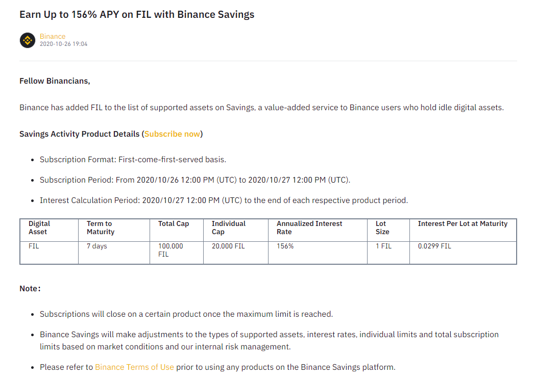 바이낸스에서 파일코인의 FIL토큰홀더들을 대상으로 연이율 최대 156%의 이자를 지급하는 새로운 Binance Savings 상품을 출시했습니다.