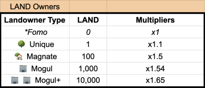 - 페이즈 #2에서는 사용자가 보유하고 있는 LAND를 기준으로 수익률 승수 제도를 도입합니다.