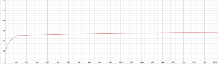 추가되는 보상 배율은 다음 곡선을 기반으로 합니다. 즉, 1개의 LAND를 보유하고 있는 경우 1.1배의 SAND 보상을 얻을 수 있고, 100개의 LAND를 보유하고 있는 경우 1.5배의 SAND 보상을 얻을 수 있습니다.