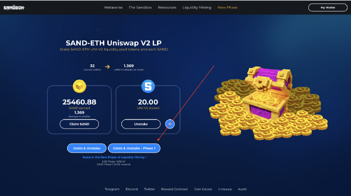 페이즈#1과 페이즈#2 모두 SAND/ETH 유니스왑 풀에서의 유동성 마이닝을 진행합니다
