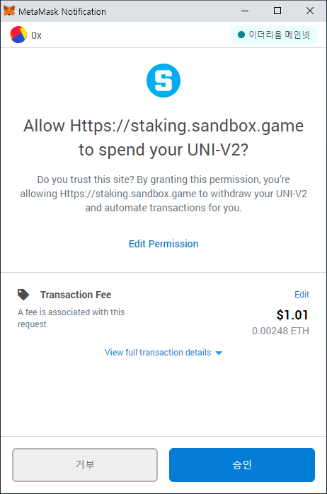 ⑥ 위와 같은 트랜잭션 승인 팝업창이 나타나면 트랜잭션 수수료를 확인하고 승인 버튼을 클릭합니다. (현재 기준으로는 약 1달러 정도의 수수료가 나가네요)