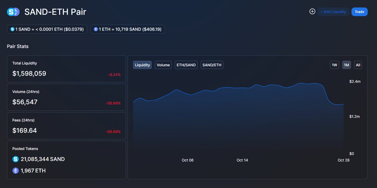 - 유니스왑 SAND/ETH 페어 링크 : https://info.uniswap.org/pair/0x3dd49f67e9d5bc4c5e6634b3f70bfd9dc1b6bd74