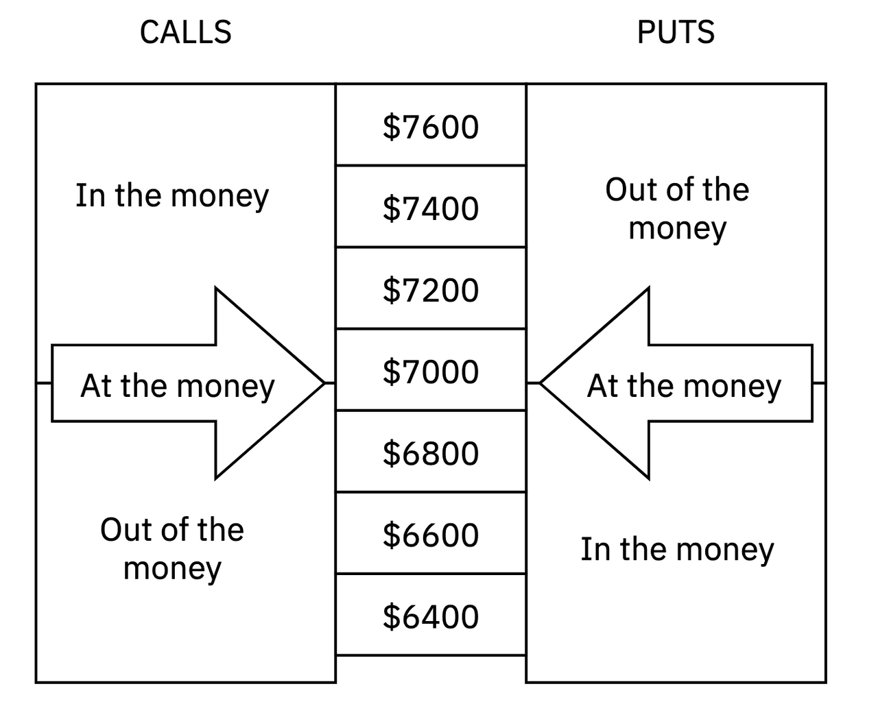 예를 들어 비트코인의 현재 가격이 7,000달러인 경우 BTC옵션의 Moneyness는 다음과 같습니다.