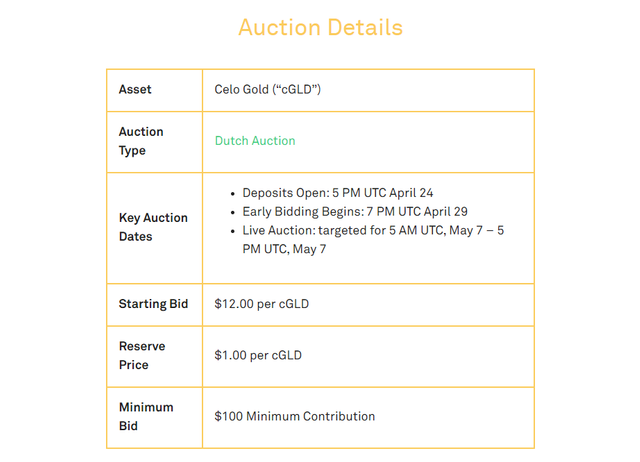 일단 cGLD (Celo Gold) 토큰 세일은 더치 옥션(Dutch Auction)형태로 진행되며 $12달러에서 시작해서 최소 $1달러까지 내려가는 방식입니다.