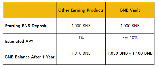 BNB Vault에는 BNB를 스테이킹 해 놓으면 받게 되는 Flexible Savings의 이자, 새로운 런치풀 토큰의 BNB스테이킹에 따른 토큰 파밍, DeFi 스테이킹 이자, 바이낸스 스마트체인 일드파밍 참여에 따른 이자 등이 모두 포함되기 때문에 어떤 상품에 BNB를 스테이킹 하는 것이 가장 좋은지 결정이 어려운 분들이 사용하면 좋을 것으로 보입니다.