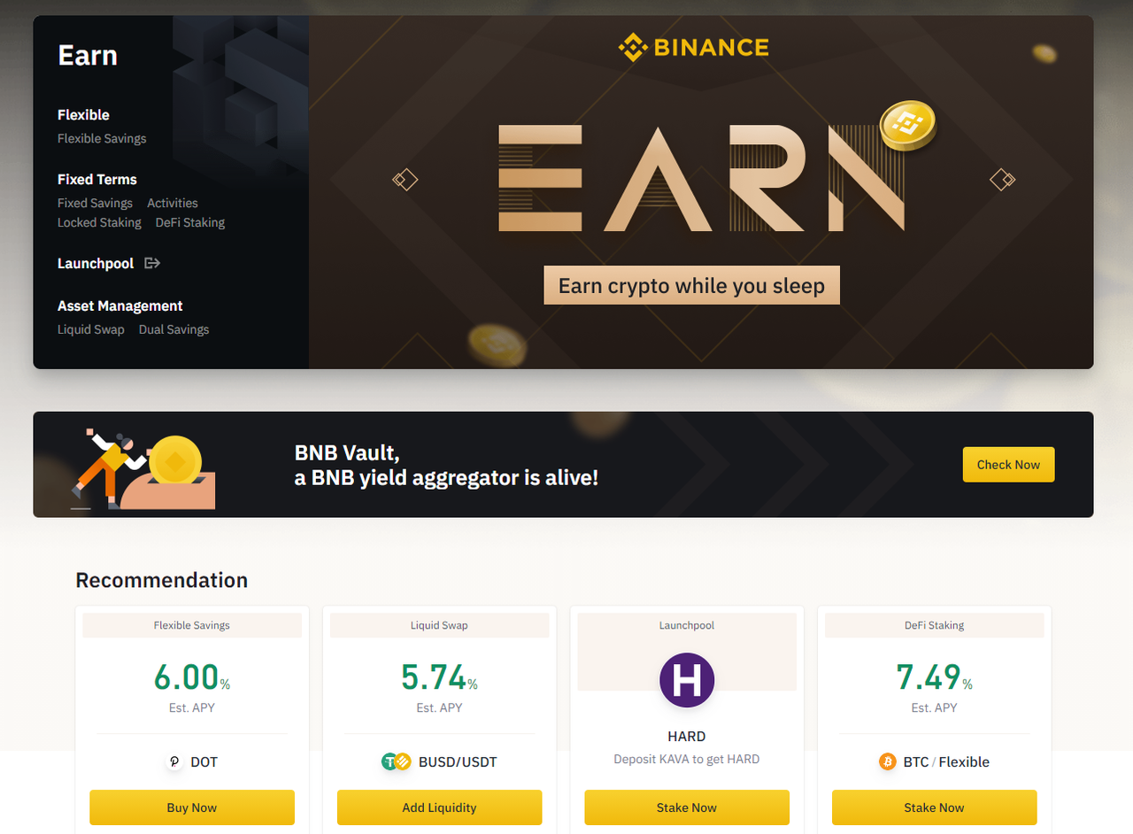 안녕하세요, 디온입니다. 바이낸스에서 하나의 인터페이스를 통해 바이낸스 스마트체인(BSC), 런치풀, 세이빙즈, 디파이 스테이킹 등 다양한 혜택을 결합한 Binance Earn의 새로운 기능인 BNB Vault를 출시하였습니다.