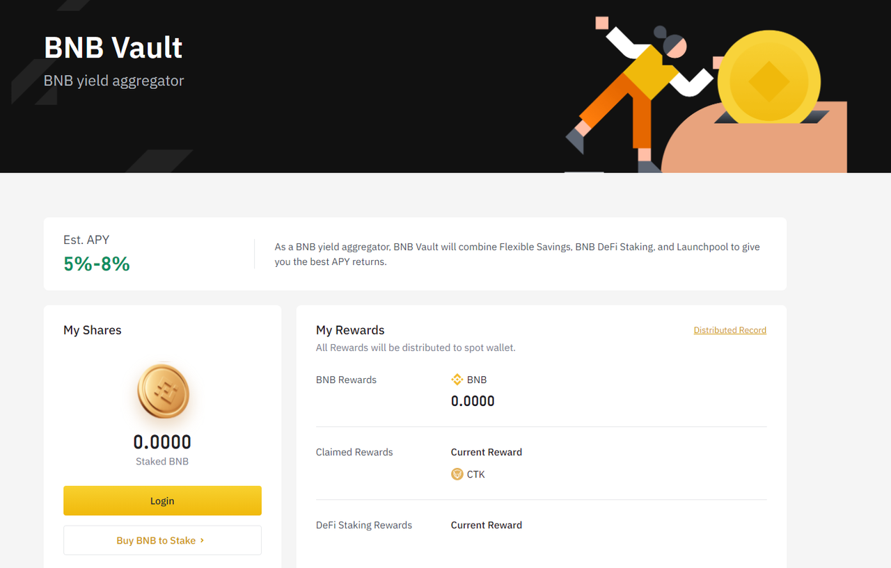BNB Vault는 바이낸스코인(BNB)의 일드 애그리게이터(수익 집계 플랫폼)으로 Flexible Savings, BNB DeFi Staking, Launchpool 등을 결합하여 BNB홀더들에게 BNB보유기간 동안 최고의 APY를 제공하는 서비스입니다.