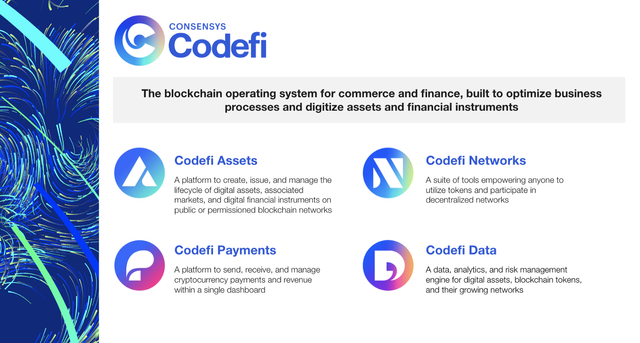 지난 2019년 9월에 Consensys에서 공개한 이더리움 기반 엔터프라이즈 고객들을 상대로 한 암호화폐 및 법정화폐 오퍼레이팅 시스템 코디파이(Codefi)의 윤곽도 천천히 그 모습을 드러내고 있습니다.