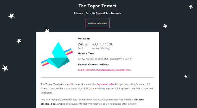 안녕하세요, 디온입니다. 이더리움 2.0 프로토콜을 개발하고 있는 프리즈마틱 랩스가 지난 4월 16일에 공개한 Topaz 테스트넷에 밸리데이터(Validators)로 참여한 노드의 수가 2만 개를 돌파하였습니다.