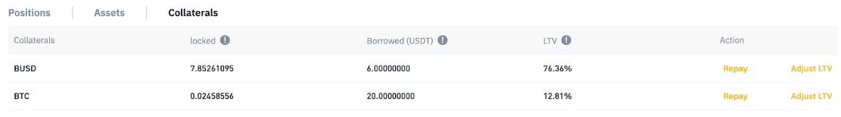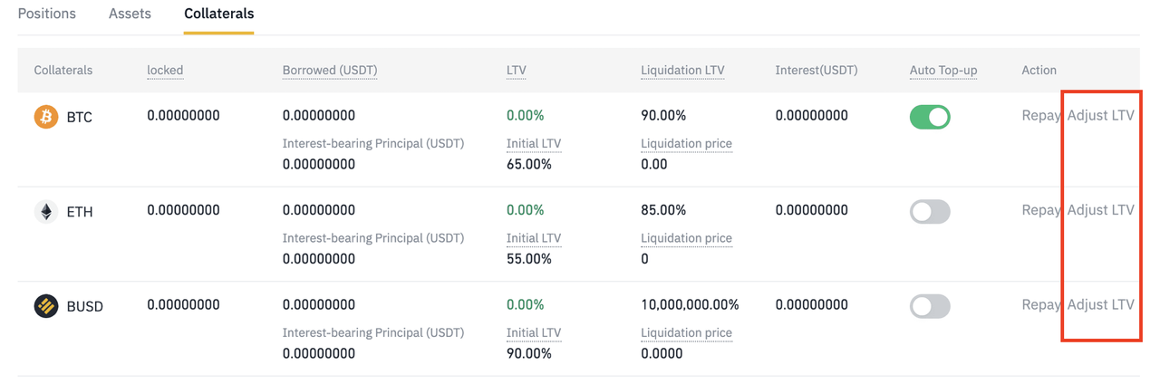 ① Collaterals탭에서 Adjust LTV를 클릭합니다.