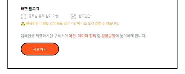 타겟 팔로워의 경우 해외유저의 팔로우도 상관 없는 경우에는 [글로벌 유저 참여 가능]을, 한국인 팔로워만 필요한 경우에는 [한국인만]옵션을 선택하고 제출하기 버튼을 클릭합니다.