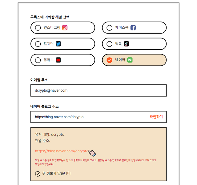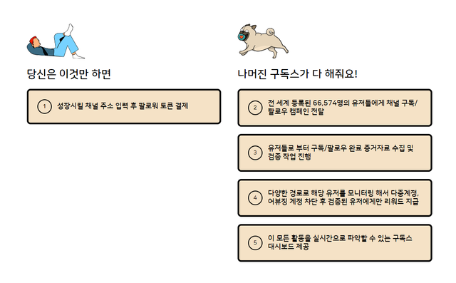 이용자가 할 일이라곤 (1) 부스팅 채널 주소 입력하기 / (2) 팔로워 토큰 결제뿐이며, 봇이 아닌 실제 유저가 진짜로 팔로우 또는 구독을 완료했는지, 어뷰징이나 다중계정이 아닌지 등은 구독스에서 자동으로 모니터링 한 후 리워드를 지급합니다.