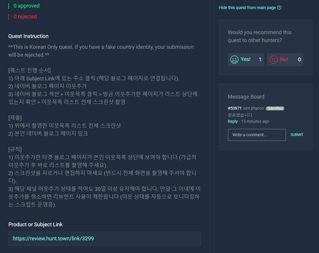 잠시 잊고 할 일을 하다가 다시 접속을 해보면, 위와 같이 내 블로그에 봇이 아닌 실제 유저가 팔로우를 완료한 것을 확인하실 수 있습니다. 나를 팔로우한 유저가 제출한 스크린샷의 검증 등은 구독스에서 자동으로 완료를 해주기 때문에 내가 직접 하나씩 확인해 볼 필요가 없습니다.