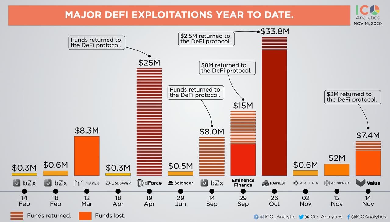 2020년은 "디파이의 해"라고 해도 무방할 정도로 엄청난 붐과 버블이 함께 찾아왔었으나, 그와 동시에 정말 많은 자산들의 피해가 발생했던 한 해이기도 합니다. 수차례 해킹을 당하며 "바지락(BZRX) 구멍"이라는 소리를 들었던 bZx를 비롯하여 메이커다오, 밸런서, dForce, 뱅코르 등 꽤나 유명세가 있고 오랜시간 개발이 진행되어 왔던 참 많은 디파이 프로젝트들이 공격을 당했습니다.