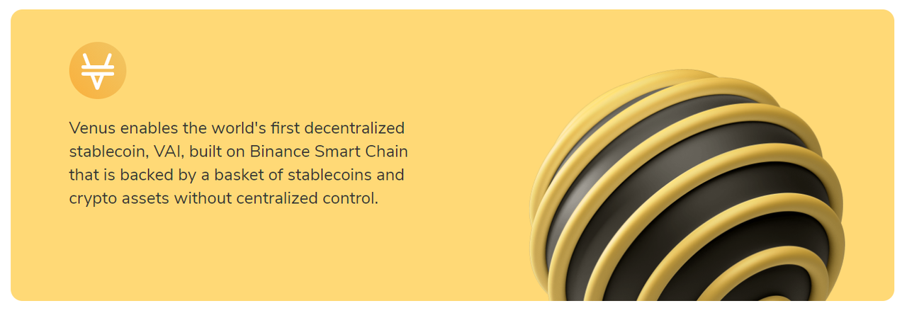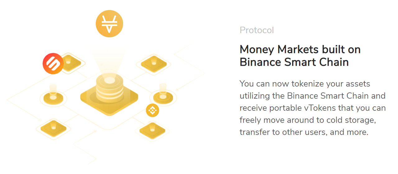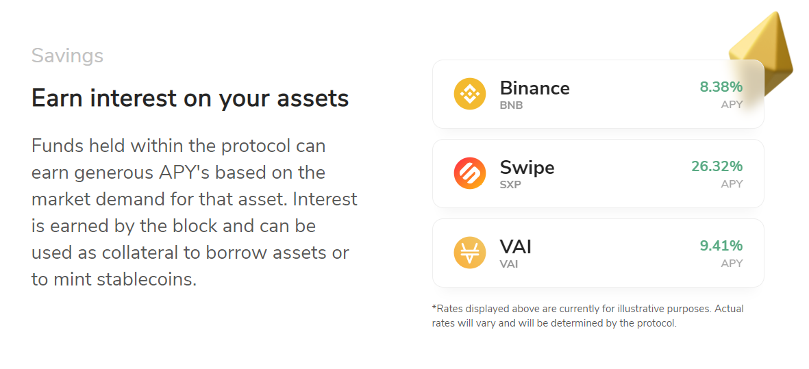 BSC기반으로 발행된 BNB, SXP, XVS 등의 토큰을 보유하고 있는 토큰 홀더들은 렌더(대출자)가 되어 일정한 이자를 받거나 담보 제공을 통해 스테이블코인인 VAI를 발행할 수 있고, BNB나 SXP, XVS가 필요한 차입자들은 일정한 이자를 지급하고 해당 토큰들을 탈중앙화된 방식으로 빌릴 수 있습니다.