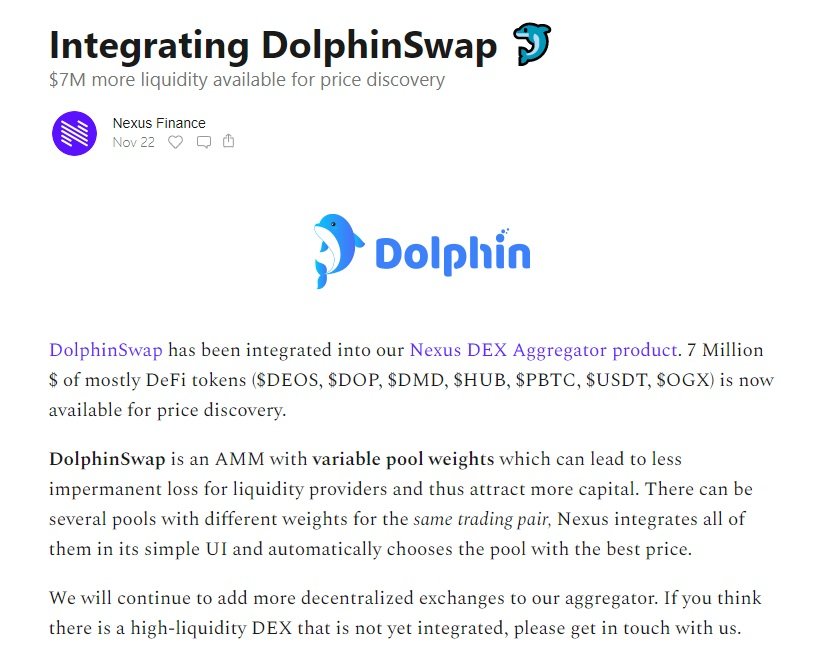 현재 Nexus Exchange에는 DEOS, DOP, DMD, HUB, PBTC, USDT, OGX 등의 디파이 토큰들이 약 700만 달러 상당의 유동성이 공급되어 있는 돌핀스왑(DolphinSwap)이 가장 마지막에 추가가 되었으며, 계속해서 다양한 DEX들이 추가될 예정이라고 합니다.