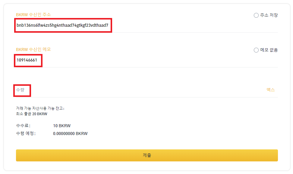 - 위에서는 수수료가 10 BKRW로 나와있으나, 바이낸스 거래소 계정으로 출금 시에는 해당 수수료가 차감되지 않으며 무료로 전송됩니다.