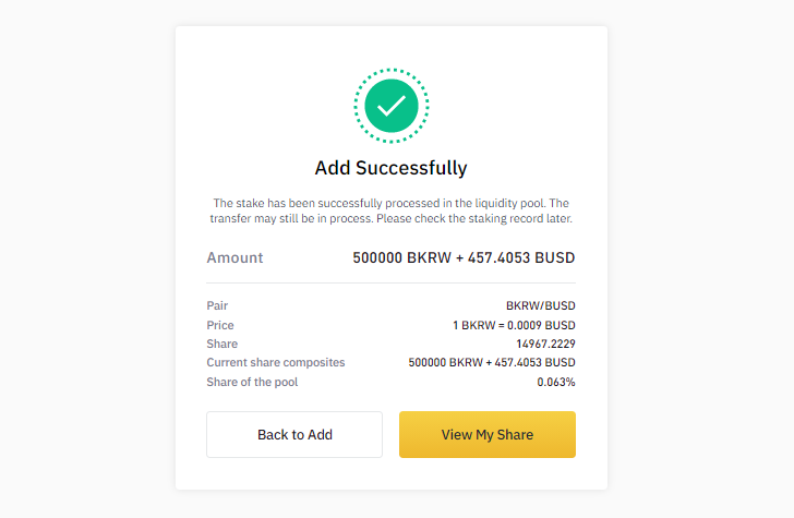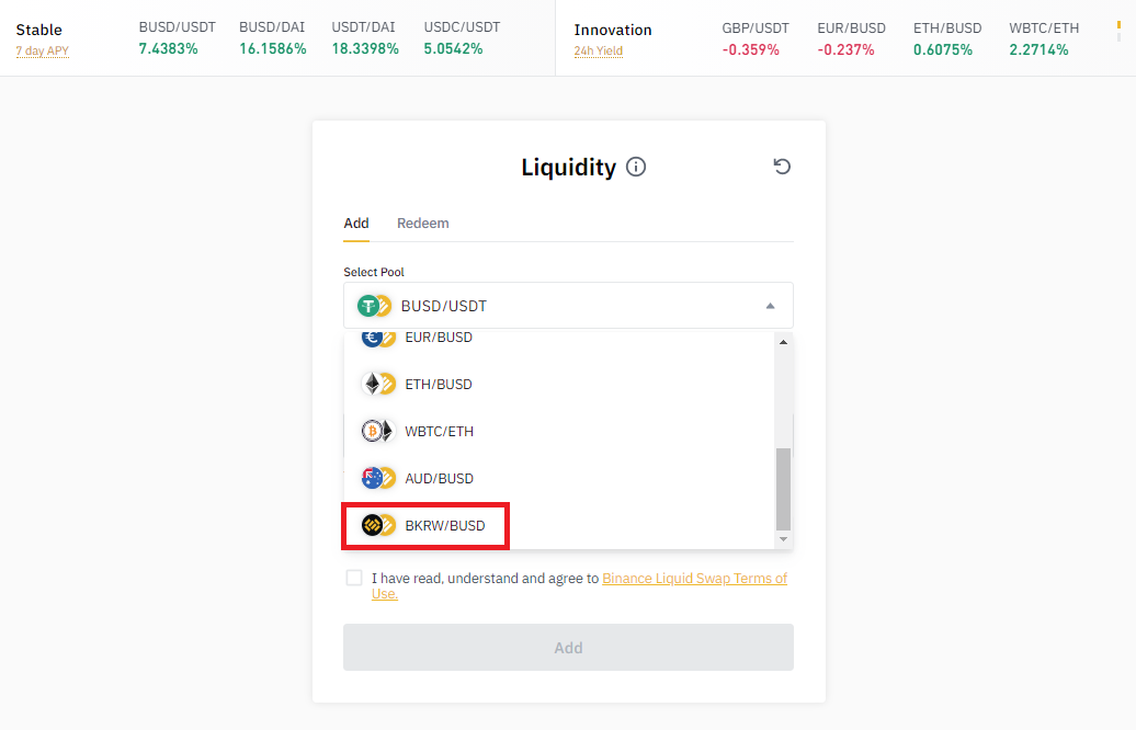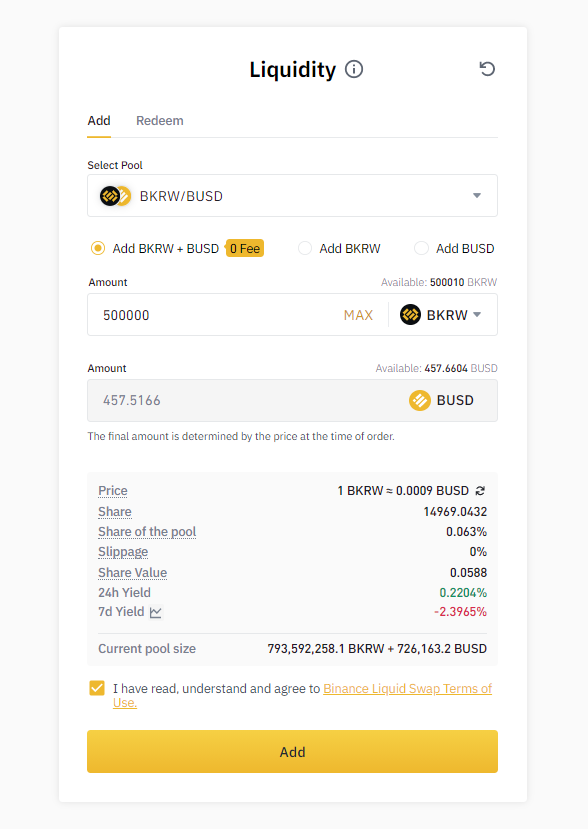 ⑤ 유동성 공급을 하고자 하는 BKRW의 수량을 입력합니다. (자동으로 이와 동일한 수량의 BUSD 수량이 입력됩니다) 그 다음에는 체크박스 클릭 후 Add를 클릭합니다.