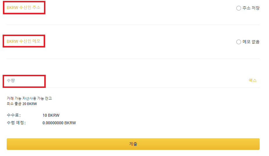 ③ 이제 [BKRW 수신인 주소 / BKRW 수신인 메모 / 수량]을 차례대로 입력해야 합니다.