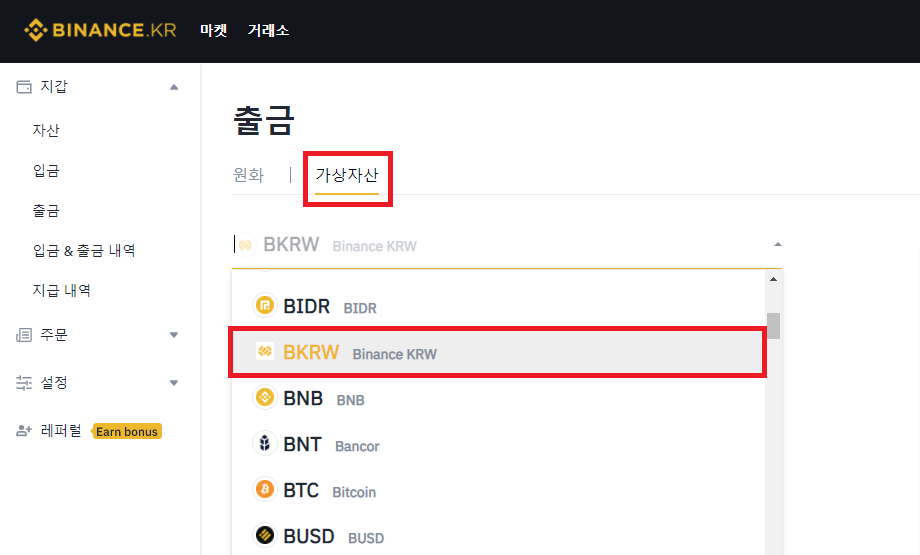 ② 출금 화면에서 원화가 아닌 [가상자산] 탭을 클릭한 뒤, BKRW를 찾아서 선택합니다.