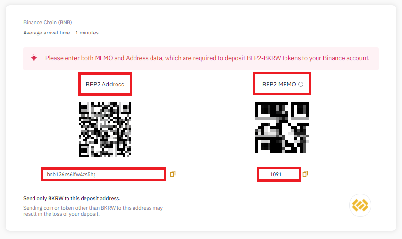 ⑥ 내 바이낸스 지갑의 BKRW입금 주소 및 MEMO를 위와 같이 확인하실 수 있습니다.