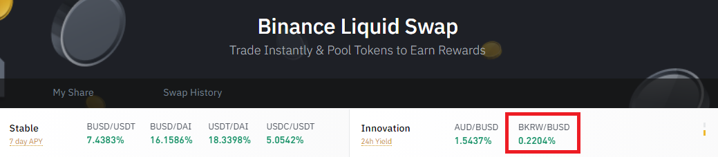 안녕하세요, 디온입니다. 어제부터 바이낸스 리퀴드 스왑(BSwap)에 BKRW/BUSD 페어가 새롭게 추가되었습니다. 이전 포스팅에서도 간략하게 설명드렸던 것처럼 바이낸스 리퀴드 스왑 또는 비스왑(BSwap)은 바이낸스 거래소에서 운영하는 중앙화된 방식의 최초의 스테이블코인 AMM 씨파이(CeFi) 서비스로, 바이낸스 사용자들은 거래소 지갑에 보유 중인 이종의 스테이블코인 USDT, USDC, DAI, BUSD 및 국가별 통화 EUR, AUD, BKRW 등의 유동성을 공급하고 이에 대한 유동성 공급 수익을 얻을 수 있습니다.