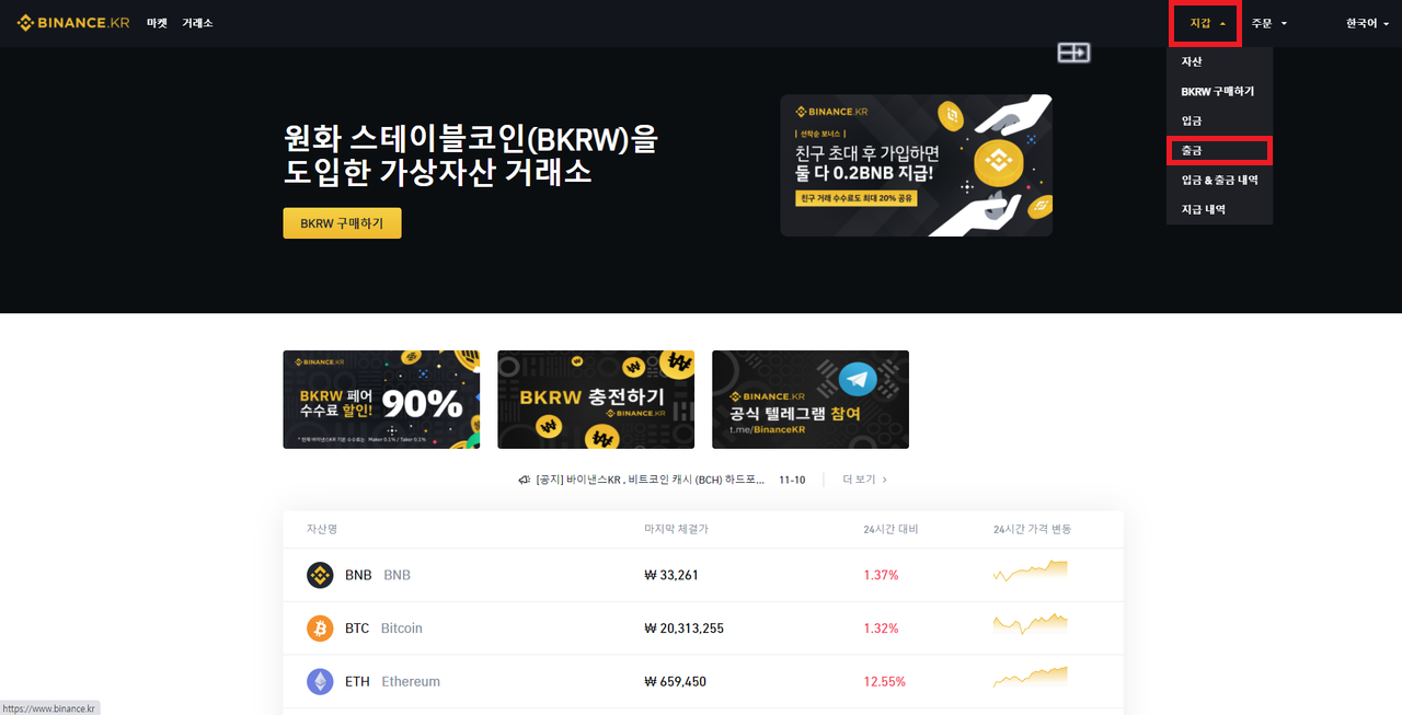 ① 바이낸스KR에 로그인 한 뒤에 우측 상단에 보이는 [지갑] → [출금]순으로 접속합니다.