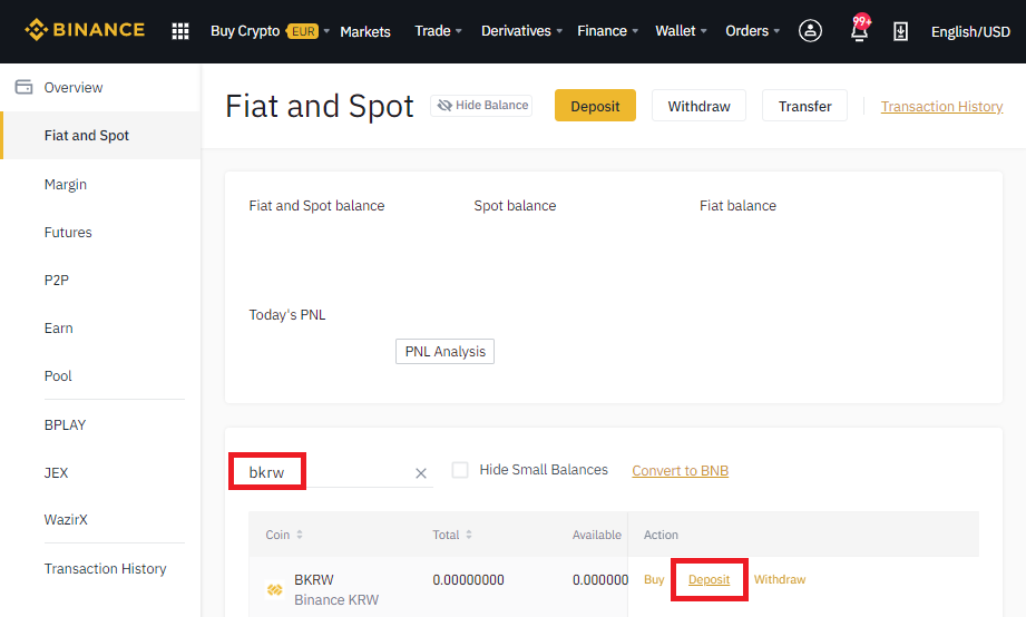 ④ 바이낸스 거래소(닷컴) 지갑에 접속하여 BKRW 입금 주소를 확인합니다. (Fiat and Spot → BKRW검색 → Deposit클릭)