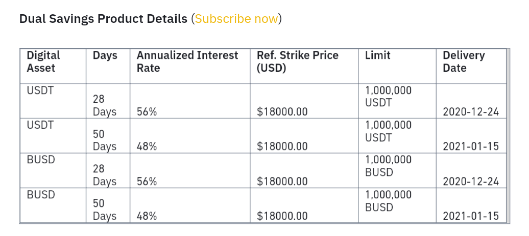 최근에 비트코인의 엄청난 가격 상승으로 인해 바이낸스 듀얼 세이빙즈의 행사 가격도 지난 차수 대비 약 7.5% 가량 상승하였습니다. 그리고 동시에 만기는 조금 더 길어졌네요.