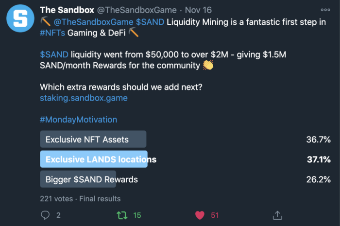 지난 11월 16일에 더 샌드박스는 트위터를 통해 SAND 유동성 마이닝 프로그램 보상으로 어떤 것이 추가되길 희망하는가에 대한 설문조사를 진행하였으며, 커뮤니티에서는 좋은 위치의 LAND 또는 특별한 NFT자산에 많은 투표를 하였습니다.