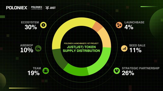 JST토큰의 토큰 타입은 트론 기반으로 발행된 TRC-20 토큰이며, 전체 발행량은 99억개입니다. 그리고 폴로닉스의 런치베이스를 통해서는 전체 발행량의 4%인 3억 9,600만 개가 판매될 예정입니다.