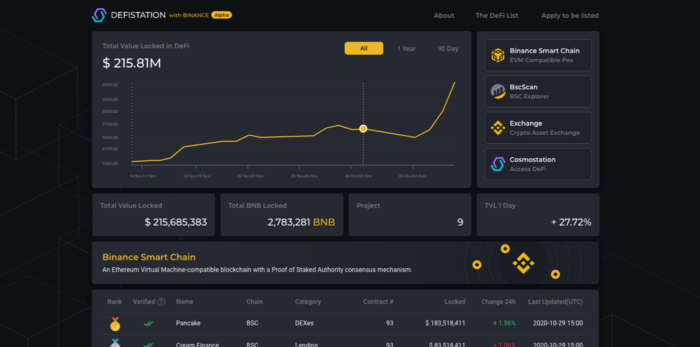 디파이스테이션은 코스모스테이션(Cosmostation)이 바이낸스 스마트 체인 기반의 프로젝트들을 위해 만든 디파이 분석 및 리더보드 사이트로 지난 10월 30일에 알파 버전이 출시되었습니다. 그동안 개인적으로도 트위터나 해외 크립토 미디어, 미디엄 블로그 등에서 개별적으로 바이낸스 스마트 체인 기반의 프로젝트들에 관한 정보를 찾는데 많은 애를 먹고 있었는데, 한 눈에 프로젝트들을 확인할 수 있어서 정말 애용하게 되는 사이트입니다.
