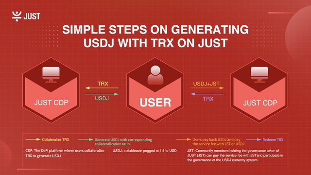 JUST란 아주 간단히 말해서 트론 생태계 버전의 메이커다오와 같은 탈중앙화된 스테이블코인 플랫폼입니다. JUST플랫폼에서 사용자들은 CDP포털을 통해 트론(TRX)을 담보로 제공하고 USD와 1:1로 페깅된 USDJ라는 스테이블 코인을 생성할 수 있습니다.
