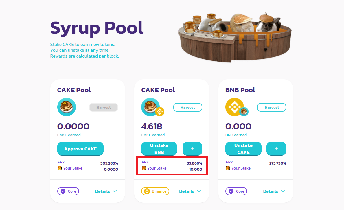 (여기서 채굴한 CAKE는 오른쪽에 보이는 BNB Pool에 스테이킹해서 BNB를 채굴하는 것도 가능합니다)