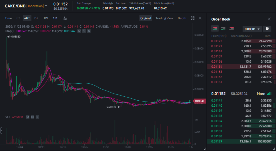 바이낸스의 공지 이후에 CAKE토큰 가격은 0.011~0.012 사이에서 움직이고 있는 상황이고, 별다른 추가 호재소식이 없는 이상에는 다시 가격이 내려갈 변동성 위험이 있기 때문에 CAKE토큰을 대량으로 매수하는 것은 조금 위험할 수 있습니다.