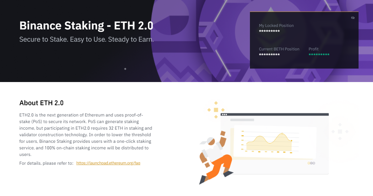 ETH2.0은 다음 세대 버전의 이더리움으로 지분 증명(Proof-of-Stake)을 사용하여 네트워크를 보호합니다. PoS는 스테이킹 수입을 창출할 수 있으나 ETH2.0에 참여하려면 32개의 ETH를 스테이킹하고 밸리데이터를 구축하는 기술이 필요합니다. 일반 사용자들의 진입장벽을 낮추기 위해 바이낸스 스테이킹은 원 클릭 스테이킹 서비스를 제공하며 온체인 스테이킹 수입이 100% 사용자들에게 배분됩니다.