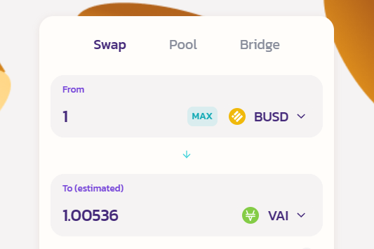 비너스 프로토콜의 스테이블코인인 VAI는 팬케이크스왑에서 BUSD를 포함한 다른 토큰들을 교환하여 얻을 수도 있으나, BNB, SXP, XVS, USDT, BUSD, USDC를 보유 중인 경우에는 굳이 직접 토큰스왑을 할 필요없이 비너스 프로토콜 앱에서 해당 자산들을 담보로 지급하고 VAI를 발행하여 채굴을 하는 것을 추천드립니다. (현재 비너스 프로토콜에서는 충분한 유동성 공급을 위해 한시적으로 VAI발행에 별도의 수수료가 부과되지 않습니다)