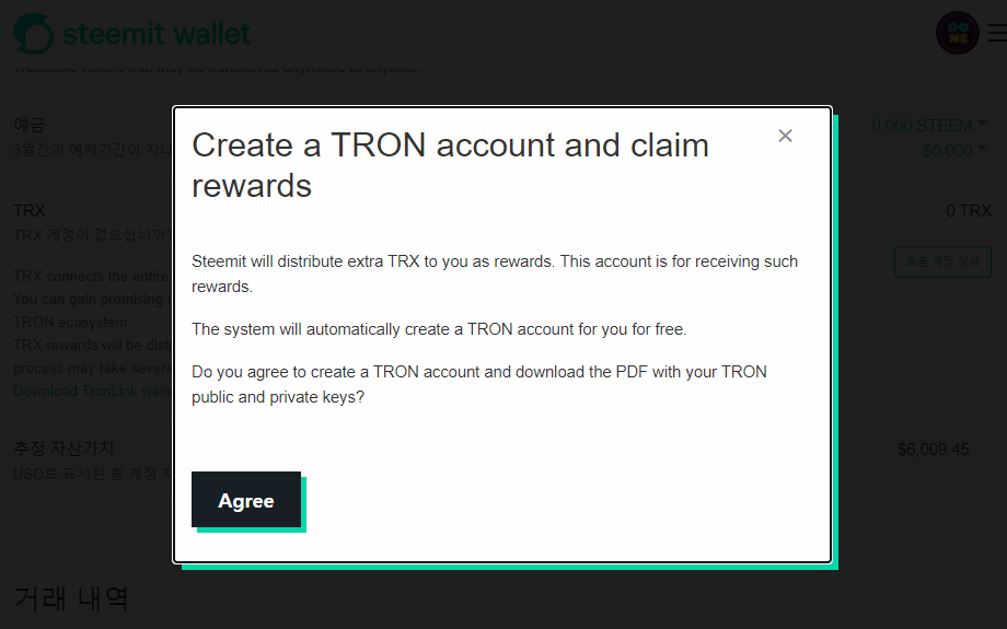 • TRX 보상을 받기 위해서는 스팀잇 지갑(steemitwallet.com)에 연결된 트론 계정을 만들어야 합니다