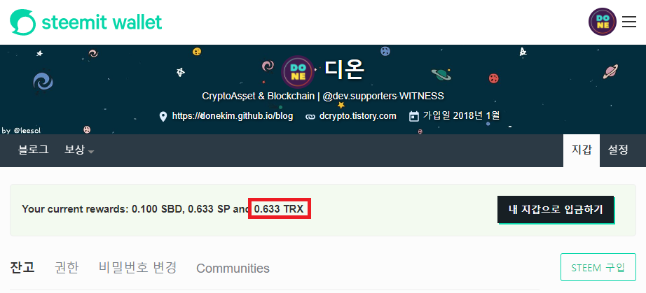 ① 스팀잇 월렛(https://steemitwallet.com)에 로그인을 합니다. 위와 같이 이미 TRX 보상이 활성화되어 있는 것을 확인하실 수 있습니다.