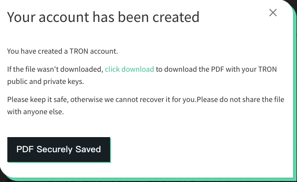 ④ 스팀잇 지갑에 연결된 트론 계정이 자동으로 생성되며 트론 계정 프라이빗키 정보가 담긴 PDF파일이 자동으로 다운로드 됩니다. 만약 파일을 다운로드 받지 못한 경우에는 녹색으로 표시된 [click download]를 클릭하여 PDF파일을 저장하셔야 합니다. (프라이빗키 정보가 담겨 있으므로 안전하게 잘 저장하셔야 합니다)