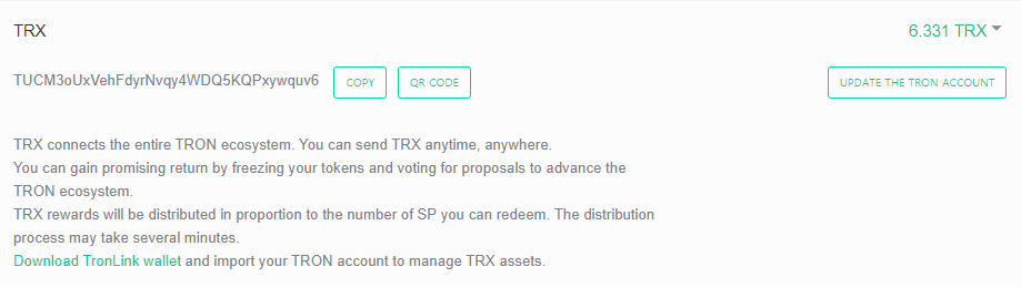 ⑤ 위와 같이 트론 지갑이 정상적으로 생성되고 트론 보상이 지갑에 들어오는 것을 확인하실 수 있습니다.