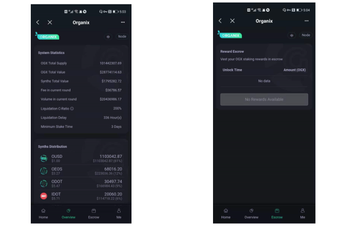 현황 탭에서는 주로 시스템의 파라미터 및 통계자료, 합성자산의 배분 데이터 등을 살펴볼 수 있으며, 에스크로에서는 1주일에 1번씩 인플레이션 보상을 확인할 수 있습니다. 락업 해제 기간은 12개월입니다.