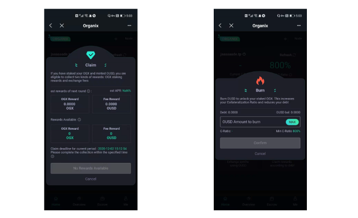 ③ [Claim(청구)] : oUSD를 발행하고 800% 이상의 담보 비율을 유지하고 있는 사용자들은 OGX의 인플레이션 보상 및 거래수수료 보상을 받을 수 있으며 Claim 메뉴에서 청구가 가능합니다.