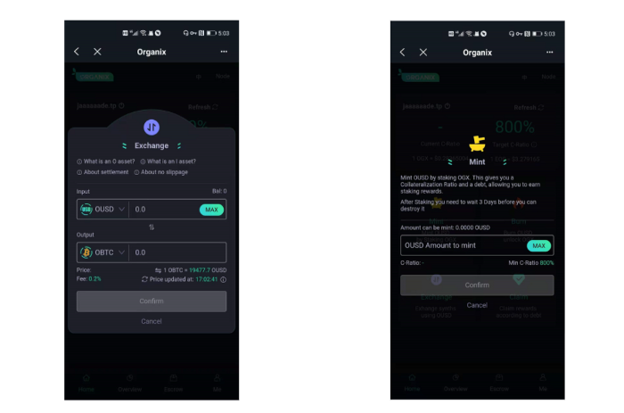 ② [Exchange(거래)] : OGX를 스테이킹하고 발행한 oUSD는 오가닉스에서 다른 합성자산으로 거래할 수 있는 거래수단이 됩니다. 다른 합성자산들은 가격이 변동하기 때문에 거래 손익이 발생하게 됩니다.